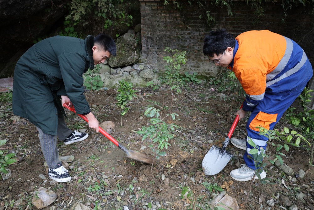 参与人员分组协作,开展植树作业。大家挥锹铲土、扶苗填坑、培土浇水,现场一片热火朝天的劳动景象。经过两个多小时的辛勤劳动,共栽植果树、沙树等各类苗木30余株,为矿山生态注入绿色动能。