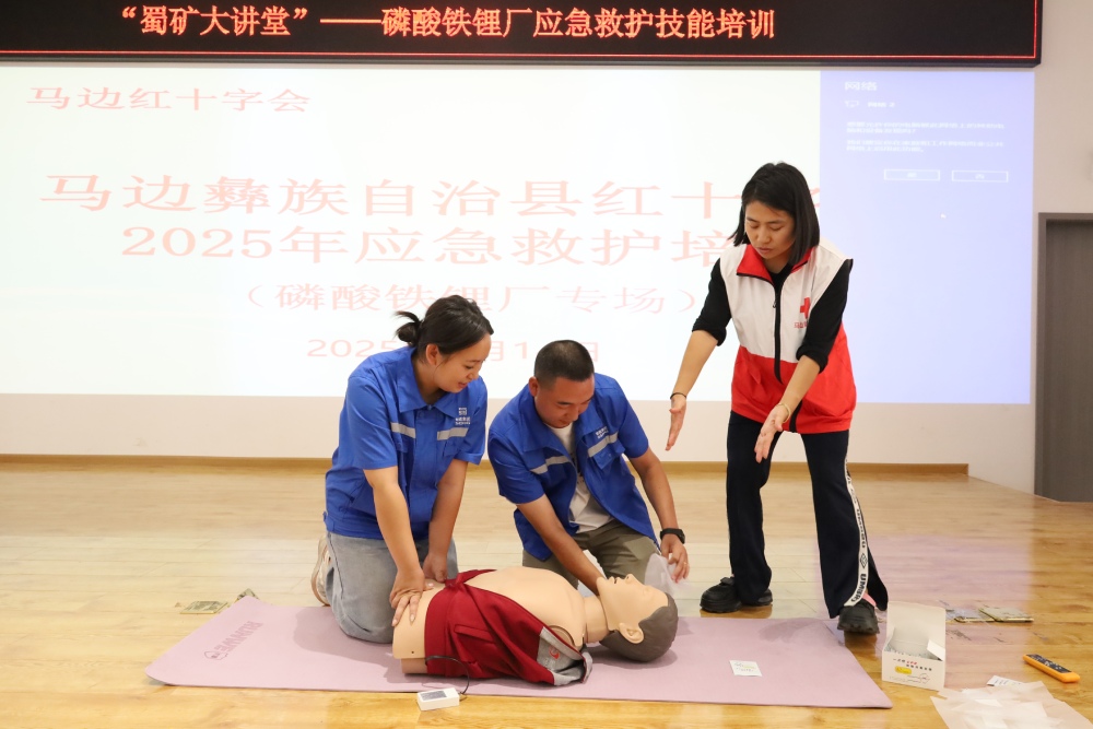 8月13日至14日,马边彝族自治县红十字会、应急救援大队、消防救援局专业教官团队,分赴williamhill中文官网三号矿山及磷酸铁锂厂开展应急救护技能专项培训。本次培训聚焦实战需求,采用现场实操模式系统讲解并演示了心肺复苏(CPR)联合AED使用、气道异物梗阻解除、创伤止血、规范包扎、骨折固定等核心急救技术,通过专业教练一对一现场督导,确保参训人员全面掌握操作标准与应急处置要点,有效提升企业关键岗位人员及一线员工的应急救护能力与突发事件响应效率。
