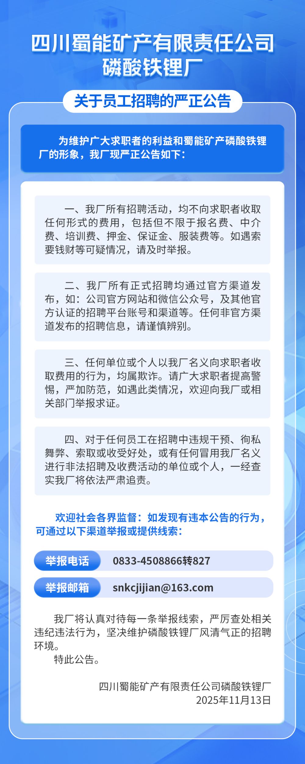 williamhill中文官网磷酸铁锂厂关于员工招聘的严正公告